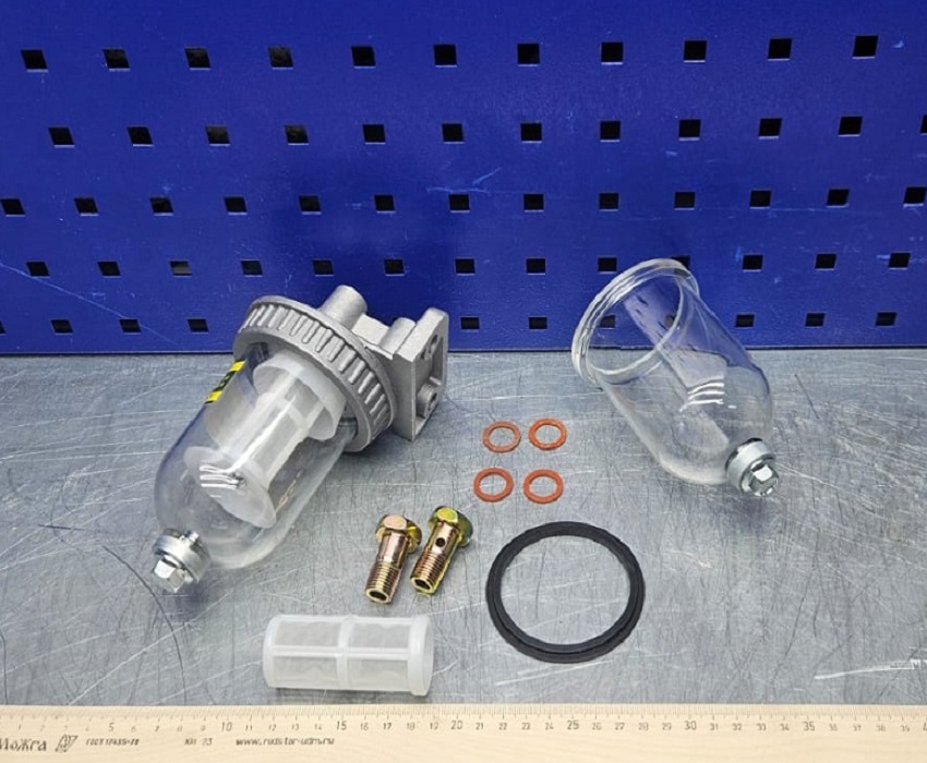 Не разбирая фильтр отстойник можно видеть уровень загрязнения фильтрующего элемента, и зафиксировать проникновение воды в топливную систему. Данный фильтр используют вместо фильтра очистки дизельного топлива МТЗ, и как вспомогательный фильтр в другие топливные системы.
